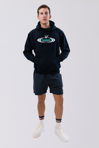 Navy hoodie. Contrast colour inside hood lining. Close front with kangaroo pocket.