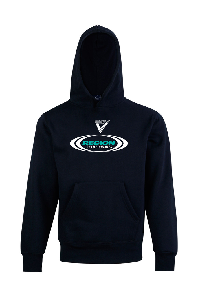 Navy hoodie. Contrast colour inside hood lining. Close front with kangaroo pocket.